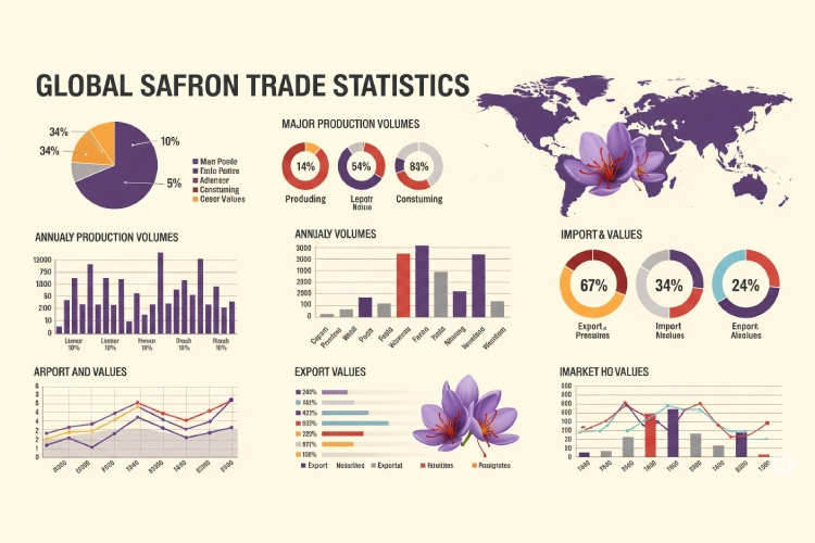 ایران بزرگترین تولیدکننده زعفران جهان است و زعفران خود را به 5 قاره و بیش از 47 کشور مختلف صادر میکند. سهم واردات بعضی از کشورها به نسبت مابقی آنها بیشتر است و دلیل اصلی این واردات بیشتر هم این است که این کشورها زعفران صادراتی ایران را خریداری میکنند و با بستهبندی مجدد، همان زعفرانها را صادر میکنند. در حال حاضر اسپانیا و امارات بهعنوان بزرگترین خریداران زعفران ایرانی در جهان بهحساب میآیند و مقادیر قابلتوجهی از زعفران به طور فلهای در بستهبندیهای 500 گرمی و 1 کیلوگرمی به این دو کشور صادر میشود.