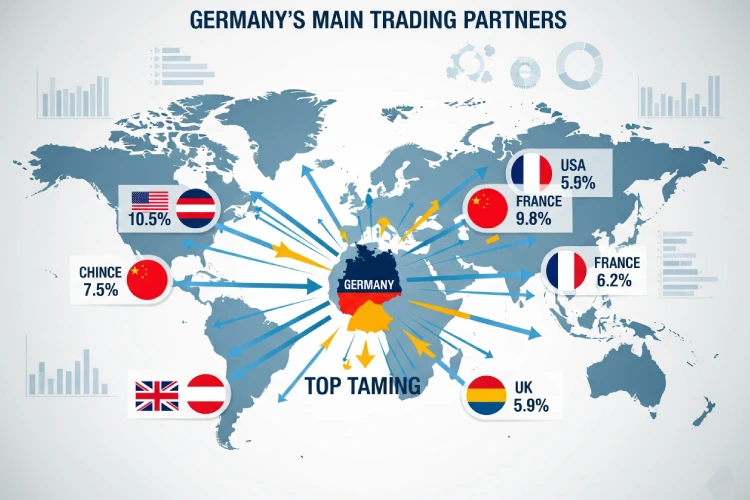 کشورهای فرانسه، کانادا، اتریش، روسیه، انگلستان، ایتالیا، هلند، لهستان، ترکیه، ایالت متحده آمریکا و چین مهمترین شریکهای تجاری آلمان هستند و بیشترین سهم تجارت را از کل تجارت بینالملل آلمان در اختیار دارند. اداره آمار فدرال آلمان هر ماه بر اساس گزارشهای مربوط به واردات و صادرات کالاها از کشورهای مختلف، آمارهای تجارت خارجی را ترسیم میکند.